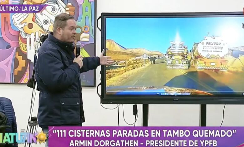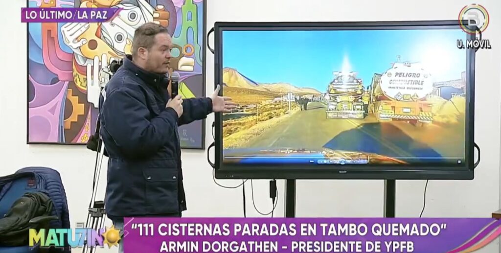 Desde ese centro de operaciones, instalado en la Casa Grande del Pueblo, el presidente de Yacimientos Petrolíferos Fiscales Bolivianos (YPFB), Armin Dorgathen, informó este viernes que las cisternas están varadas en Tambo Quemado por el bloqueo protagonizado por no más de 20 transportistas.