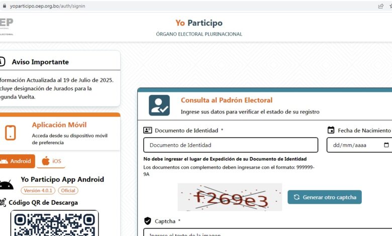 Para realizar la consulta, los ciudadanos deben ingresar al portal https://yoparticipo.oep.org.bo/, introducir su número de cédula de identidad, fecha de nacimiento y un código de seguridad. El sistema no solo indica si la persona fue elegida jurado, sino también ofrece información sobre mesa de sufragio, recinto, localidad, departamento y militancia política.