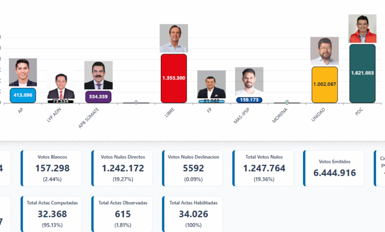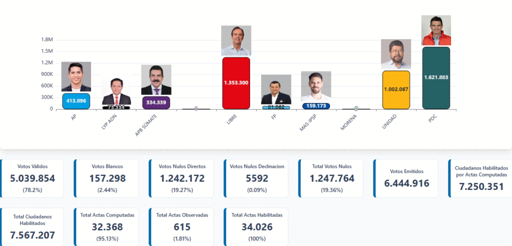 La Paz, 17 de agosto de 2025 .– El conteo rápido realizado por Órgano Electoral Plurinacional de Bolivia, con el 95% de las actas verificadas, indica que el candidato del Partido Demócrata Cristiano (PDC), Rodrigo Paz Pereira, es el ganador preliminar, obteniendo hasta el momento el 31.6% de los votos.