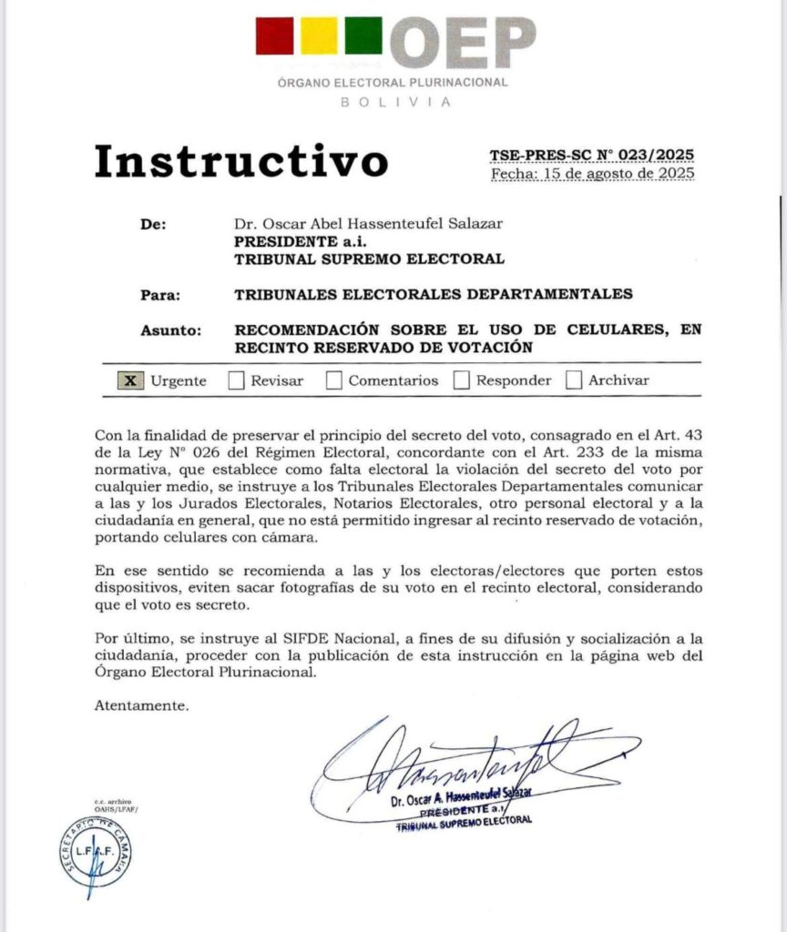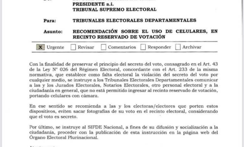 La Paz, 16 de agosto de 2025 – El Tribunal Supremo Electoral (TSE) ha emitido un instructivo dirigido a los Tribunales Electorales Departamentales, jurados, notarios, personal electoral y a la ciudadanía, estableciendo la prohibición del ingreso de celulares con cámara en los recintos de votación.